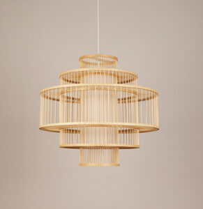 Mẫu đèn tăm trụ được làm hoàn toàn 100% nguyên liệu từ tre, nứa. Đây là mẫu đèn thuộc nhóm sản phầm đèn tăm tre, gồm nhiều nan tre tròn mảnh mai tạo thành. Sản phẩm có thiết kế sang trọng và độc đáo. Những nan tre tròn được sắp xếp theo bố cục đều đặn xen kẽ trông rất bắt mắt và sáng tạo. Phía bên trong mẫu đèn này có lớp ống vải trắng, giúp cho ánh sáng trở nên ấm cúng hơn. Mẫu thiết kế này phù hợp với không gian trang trí như quán cà phê, nhà hàng, resort, căn hộ,…Mỗi một không gian trang trí, sản phẩm sẽ toát lên những vẻ đẹp một cách thật đặc biệt và tinh tế.